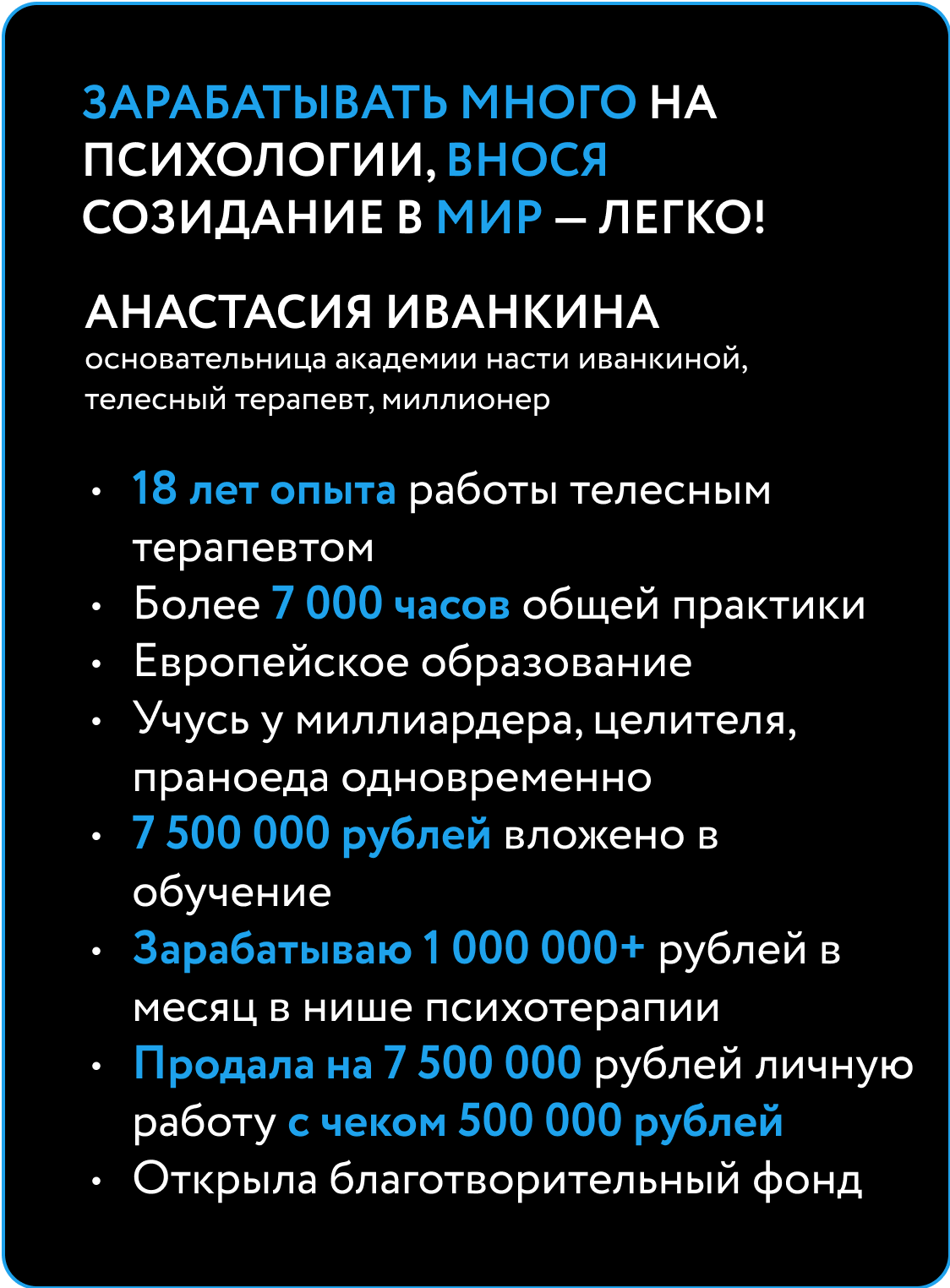 ⭐ наработаете от 150 ч личной психотерапии и практики с клиентами, чтобы легко владеть техниками психотерапии